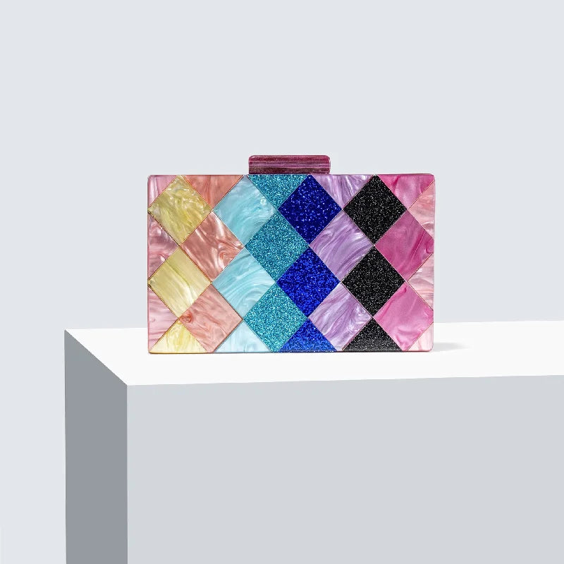 Step through the looking glass with this acrylic vanity box bag, a glossy, jewel-bright statement piece bursting with bold geometric colours and luxury shine worthy of a whimsical evening adventure.