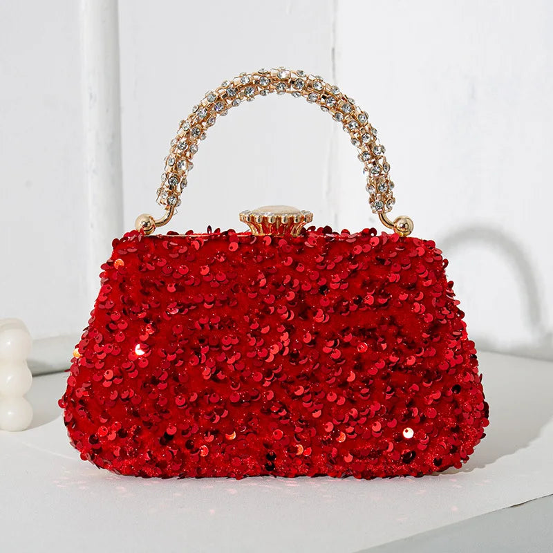 Turn heads and command the room with Crimson Temptress, an evening bag of dazzling red sequins and a crystal-encrusted handle that embodies drama, glamour, and bold elegance for any special occasion.