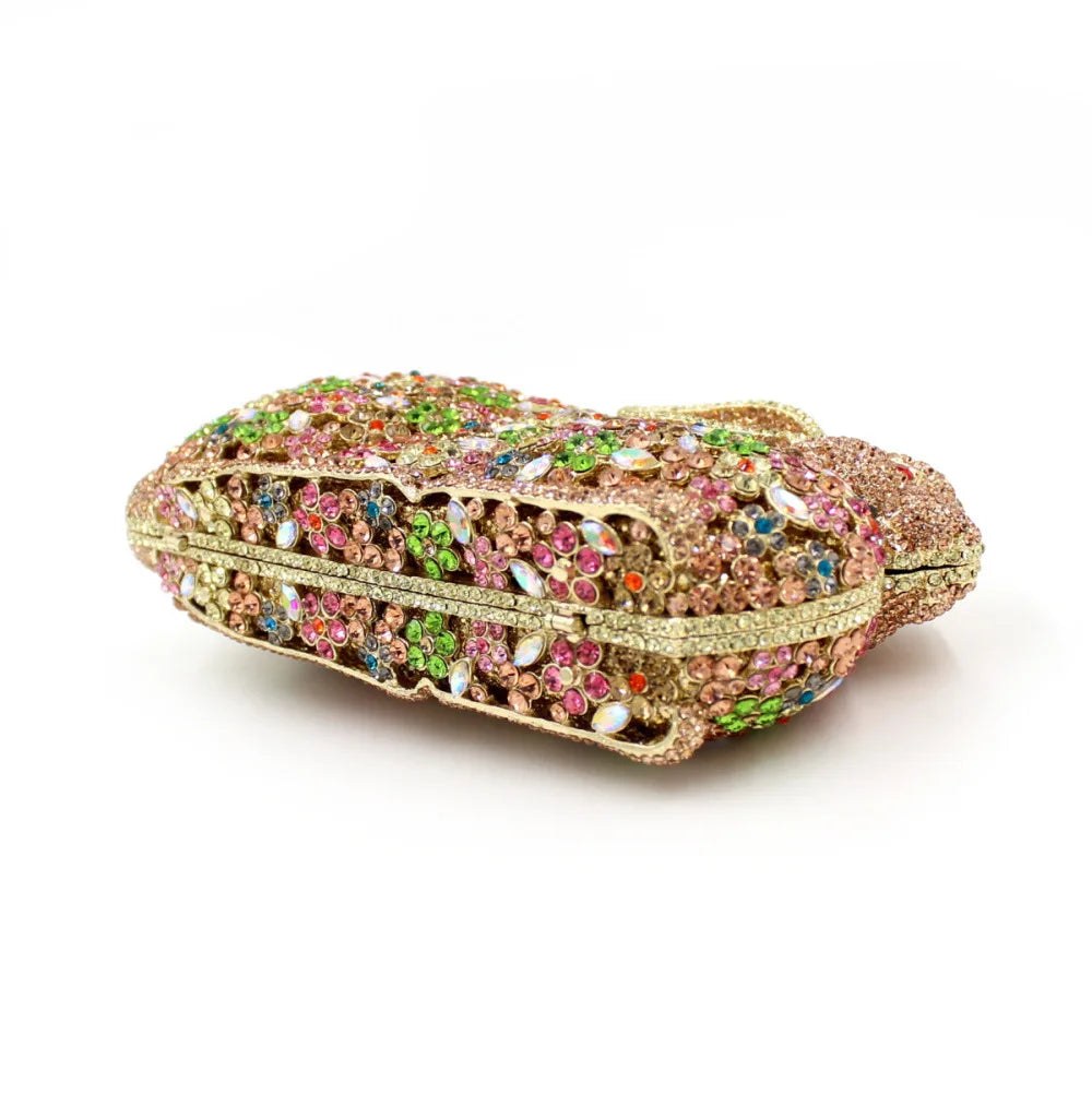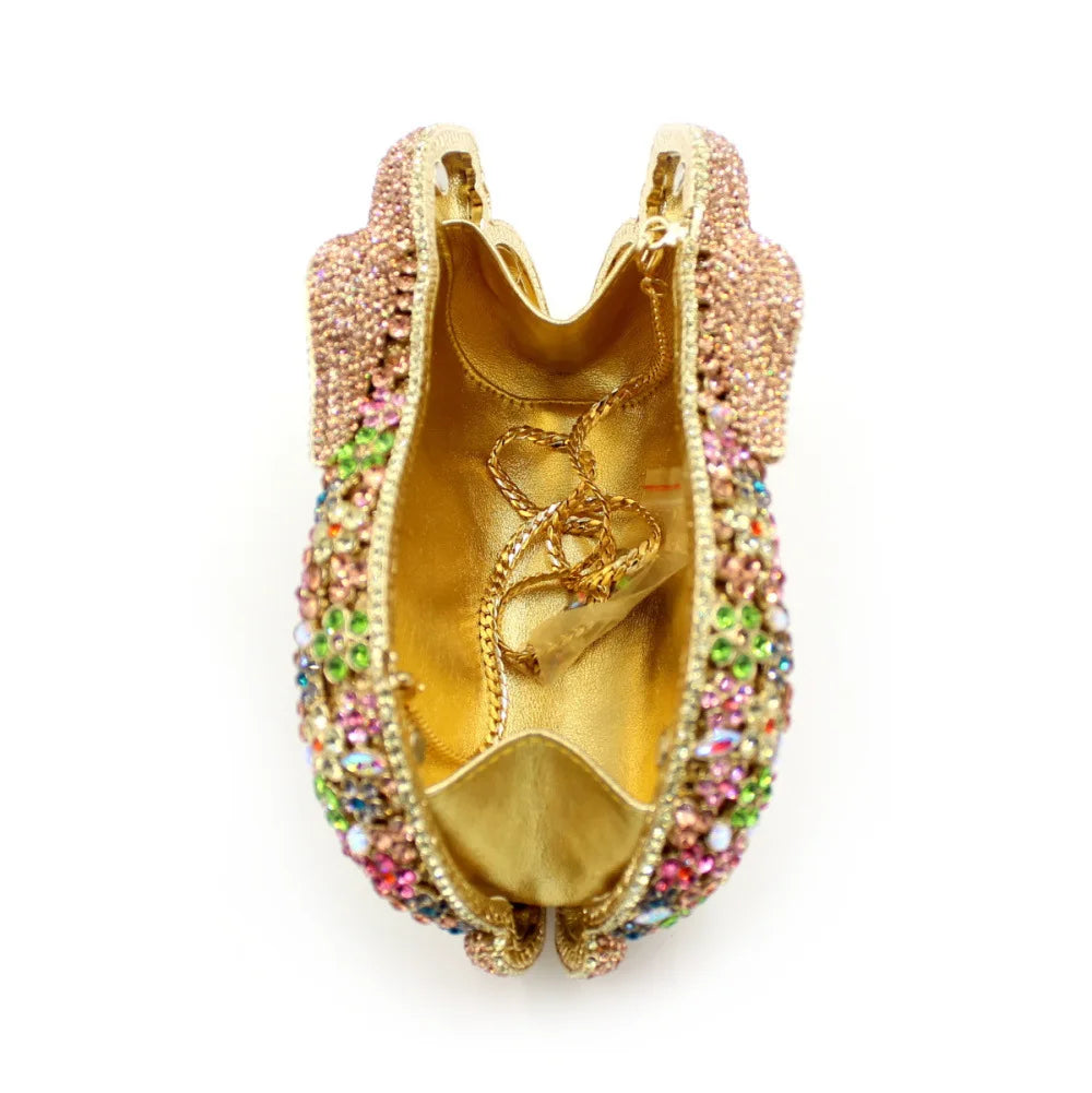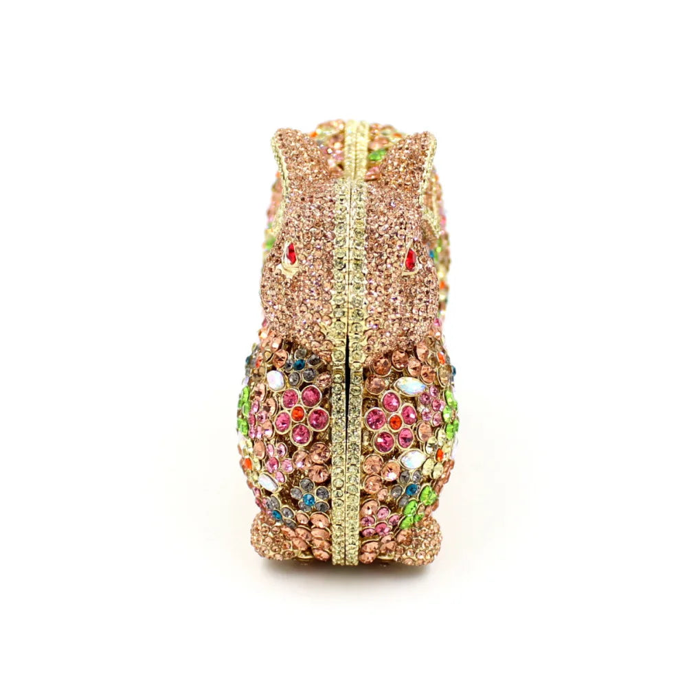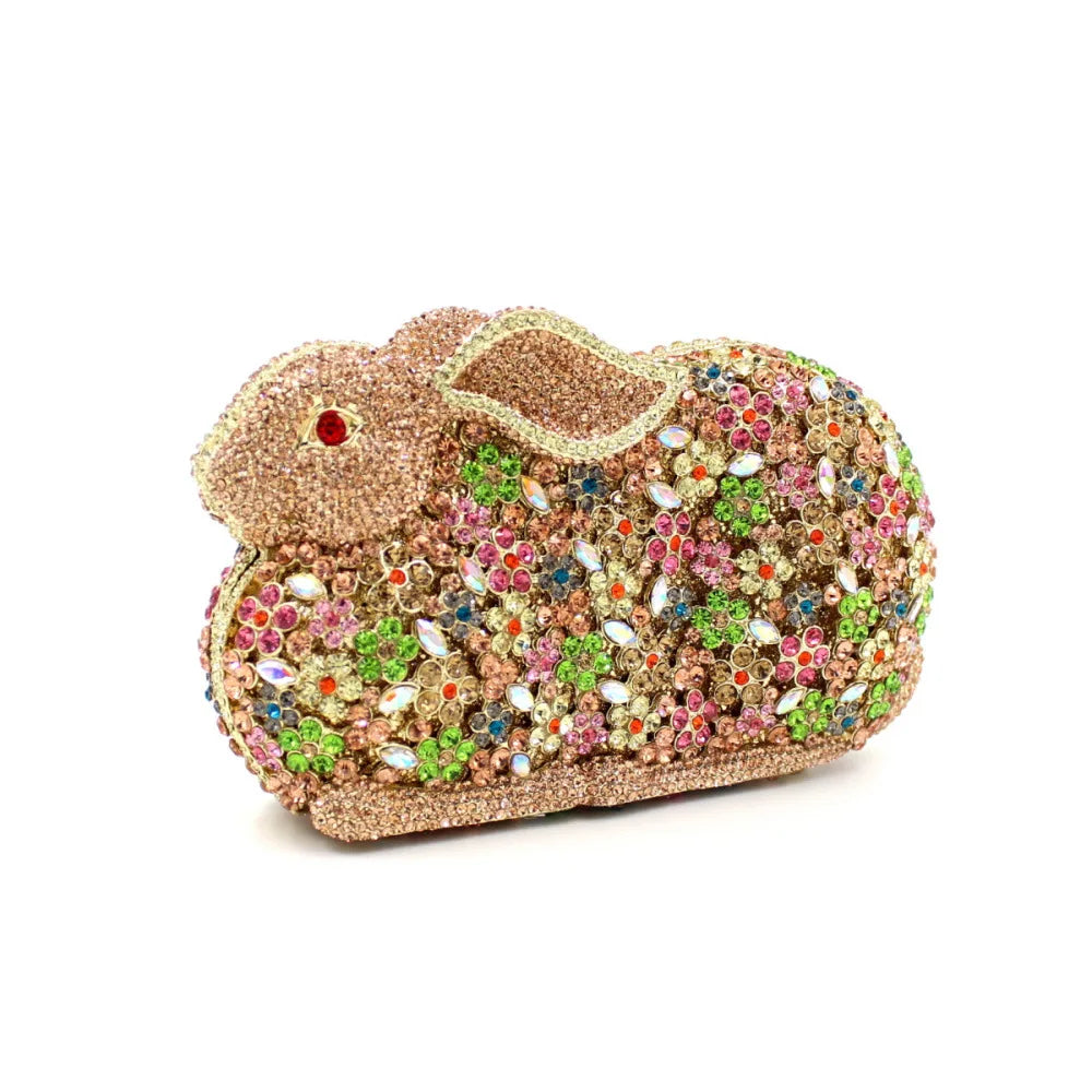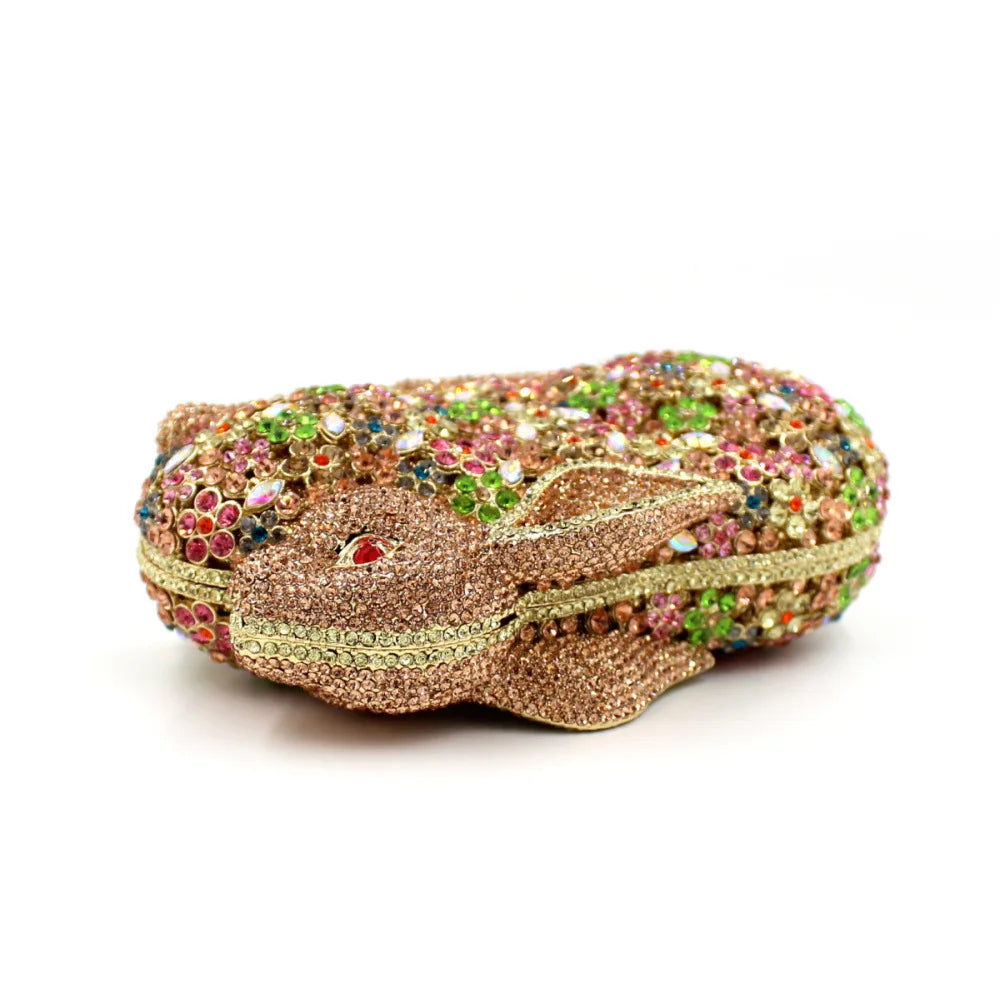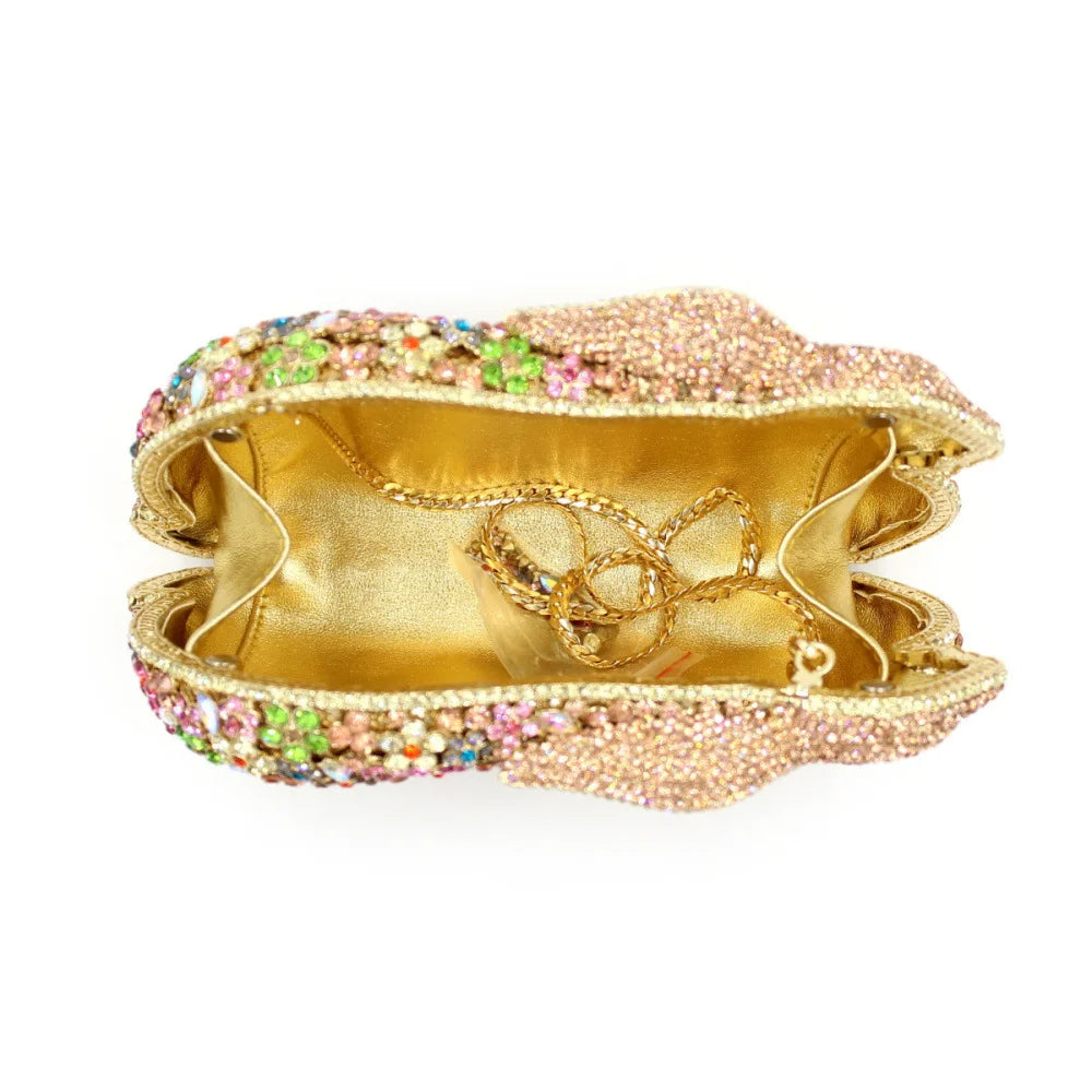 Step into a world of whimsy and sparkle with Tea Party Treasure, a rabbit-shaped clutch encrusted with multicolour diamantes that turns every evening into a magical affair.