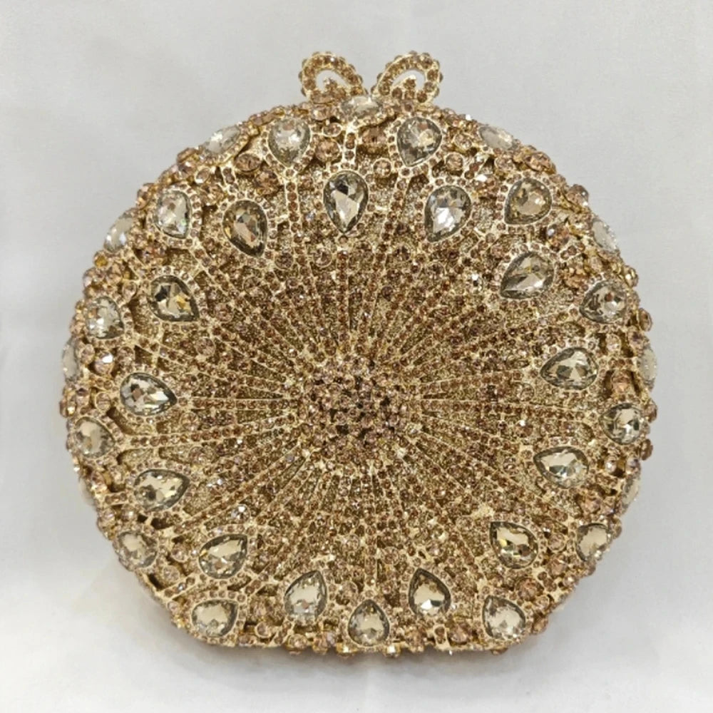 Exude mythic glamour with Olympia Goddess, a round clutch encrusted with crystals and gems, finished with a sleek clasp for a bold, divine statement.